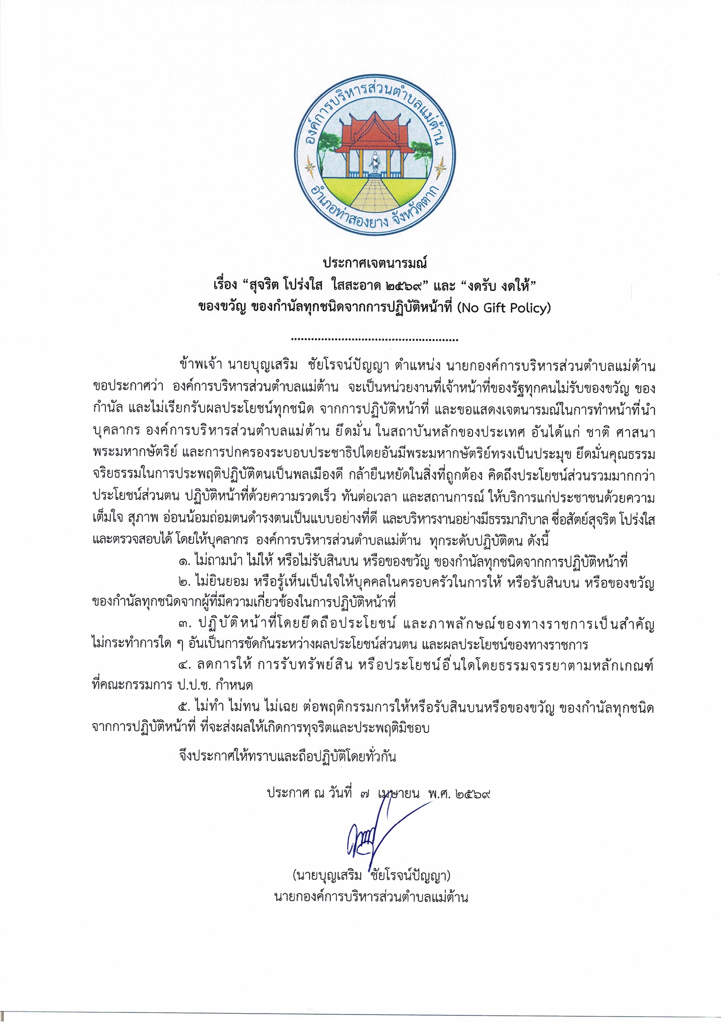 ประกาศเจตนารมณ์ สุจริต โปร่งใส ใสสะอาด 2569 "งดรับ งดให้"